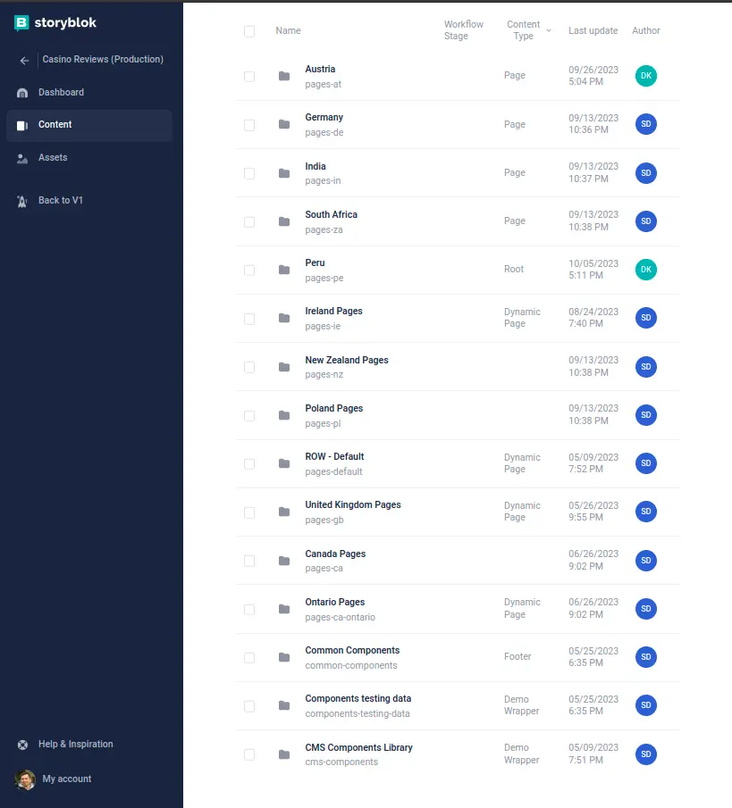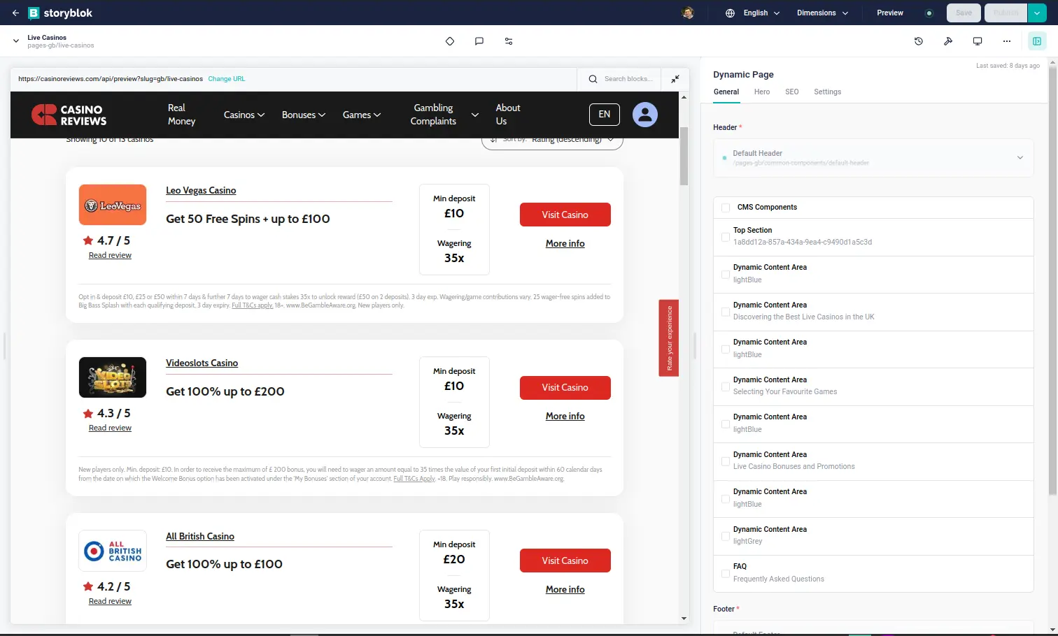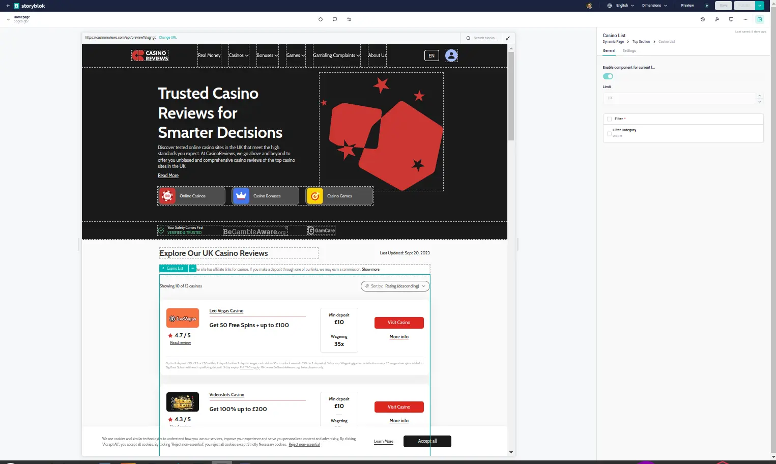 Page with casino cards opened in Storyblok for editing