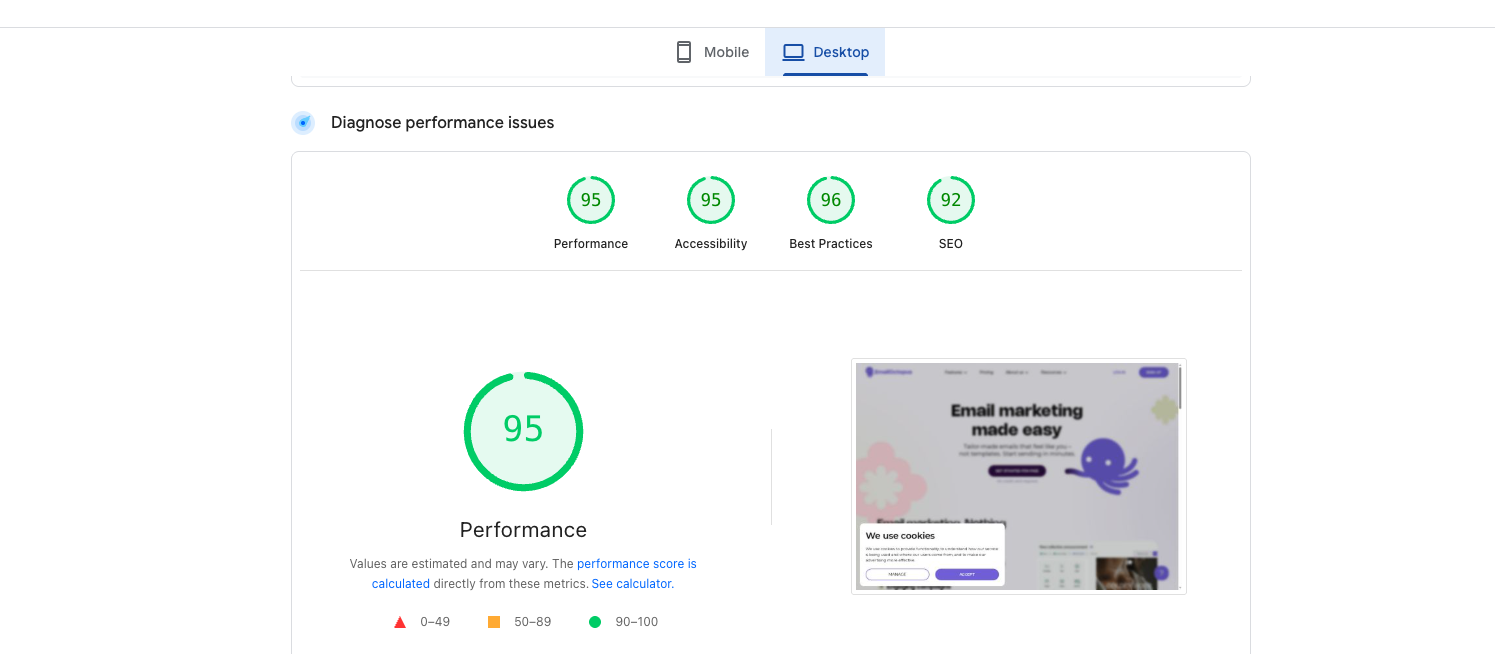 Achieved consistently green Google PageSpeed metrics on desktop and mobile, with performance, accessibility, best practices and SEO all in the 90+ range for a fast, reliable user experience