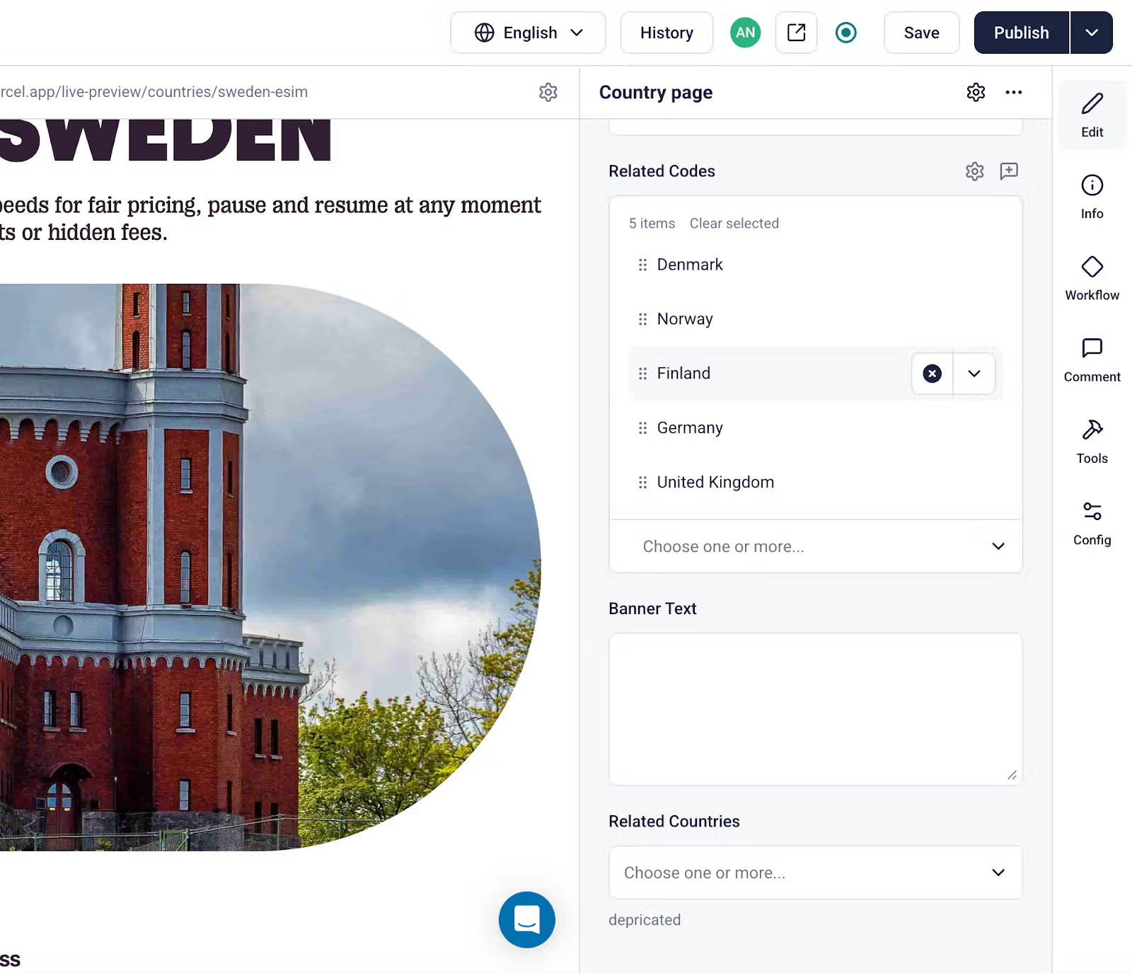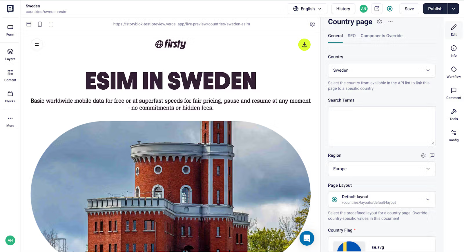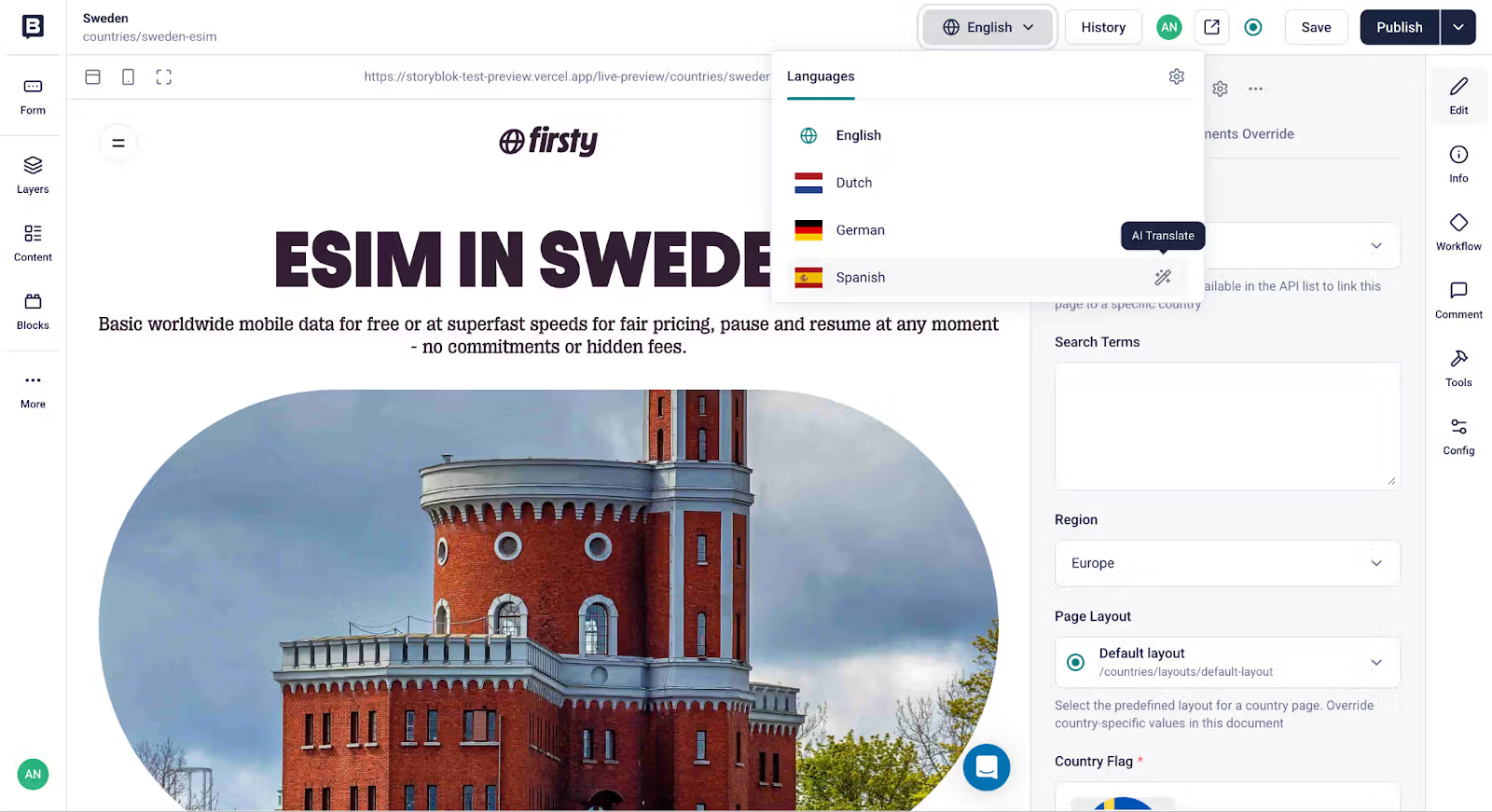 We implemented multilingual support with field-level localization fully integrated into Storyblok. Using our custom AI translation plugin, the team translated all country and blog pages into 5 additional languages within minutes — no developer involvement needed.